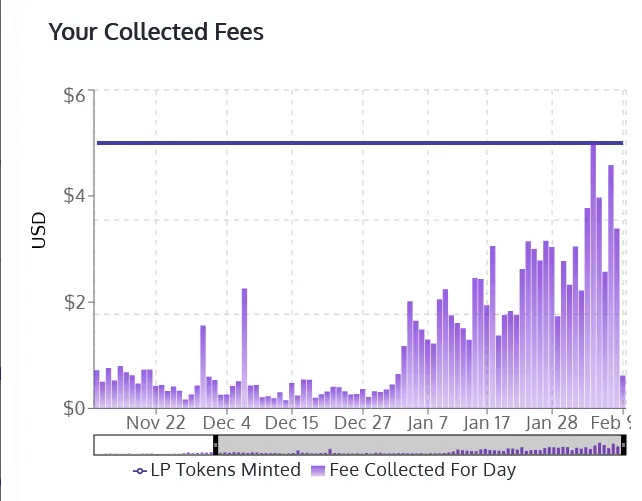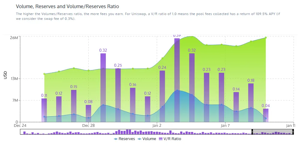 A pool with a popular token pair can have high volume, which leads to higher fees. On Uniswap each trade is charged a 0.3% protocol fee that is split evenly among the liquidity providers in the pool according to what share of the pool they own. High volume means more trading, which in turn generates more revenue for the pool. Your share of those fees is dictated by what percentage of the pool you own. The profitability of the pool based on volume and reserves is illustrated with the V/R (Volume/Reserves) ratio in the graph above.