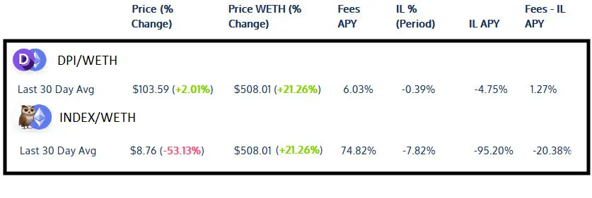 The ideal scenario for liquidity pool holders is “sideways” trading with no large swings to the downside or the upside. Given that most pools’ base asset is ETH, you have to consider ETH price movement into your risk assessment. The pairs with the lowest impermanent loss are the tokens with the highest correlation to ETH’s price. In the above example, DPI is the relatively flat blue line as it had a reasonably tight correlation with the ETH price recently. The orange line that diverges significantly is the INDEX token, which had a loose correlation with the ETH price this year