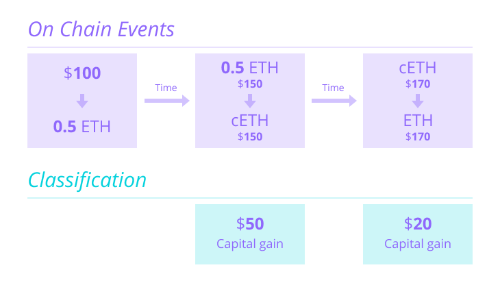 - Robert buys 0.5 ETH for $100. Two months later, he converts 0.5 ETH (which is now worth $150) to cETH via Compound. At this point, Robert recognizes a $50 capital gain for exchanging his ETH for cETH.