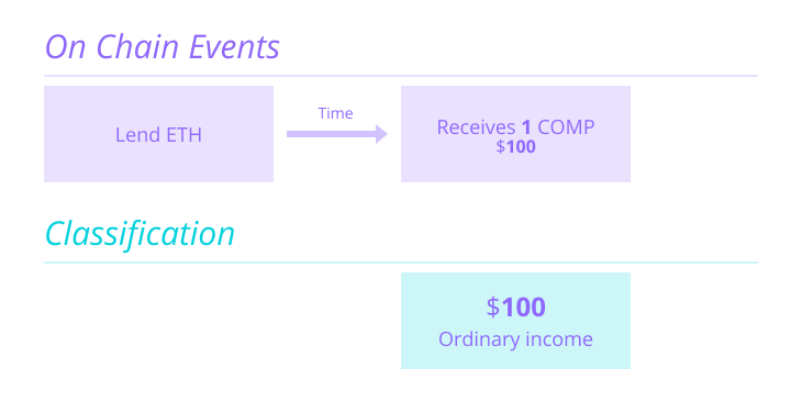 Lesley lends ETH on Compound. In return for participating in the protocol, Lesley receives 1 $COMP as a reward. At the time of receipt, this 1 $COMP is worth $100. Lesley would recognize $100 of income from this receipt of $COMP.