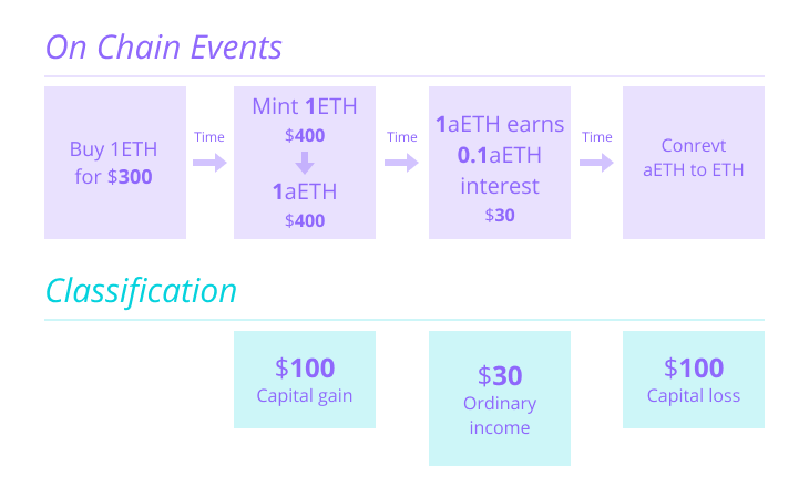 - George buys 1 ETH for $300. A few months later when that 1 ETH is worth $400, George uses it to mint 1 aETH. At this point, George recognizes a $100 capital gain by trading his 1 ETH for 1 aETH.
