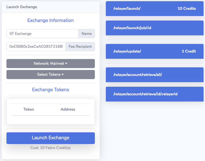 Fabrx charges customers in a simple fee structure for access to services. Upon initial sign up, they are given a default amount of credits, however, customers can purchase additional credits a la carte or in packages. These credits are consumed and deducted when accessing tools, API’s, adaptors, and functionalities such as token issuance, relayer configuration, and analytics.