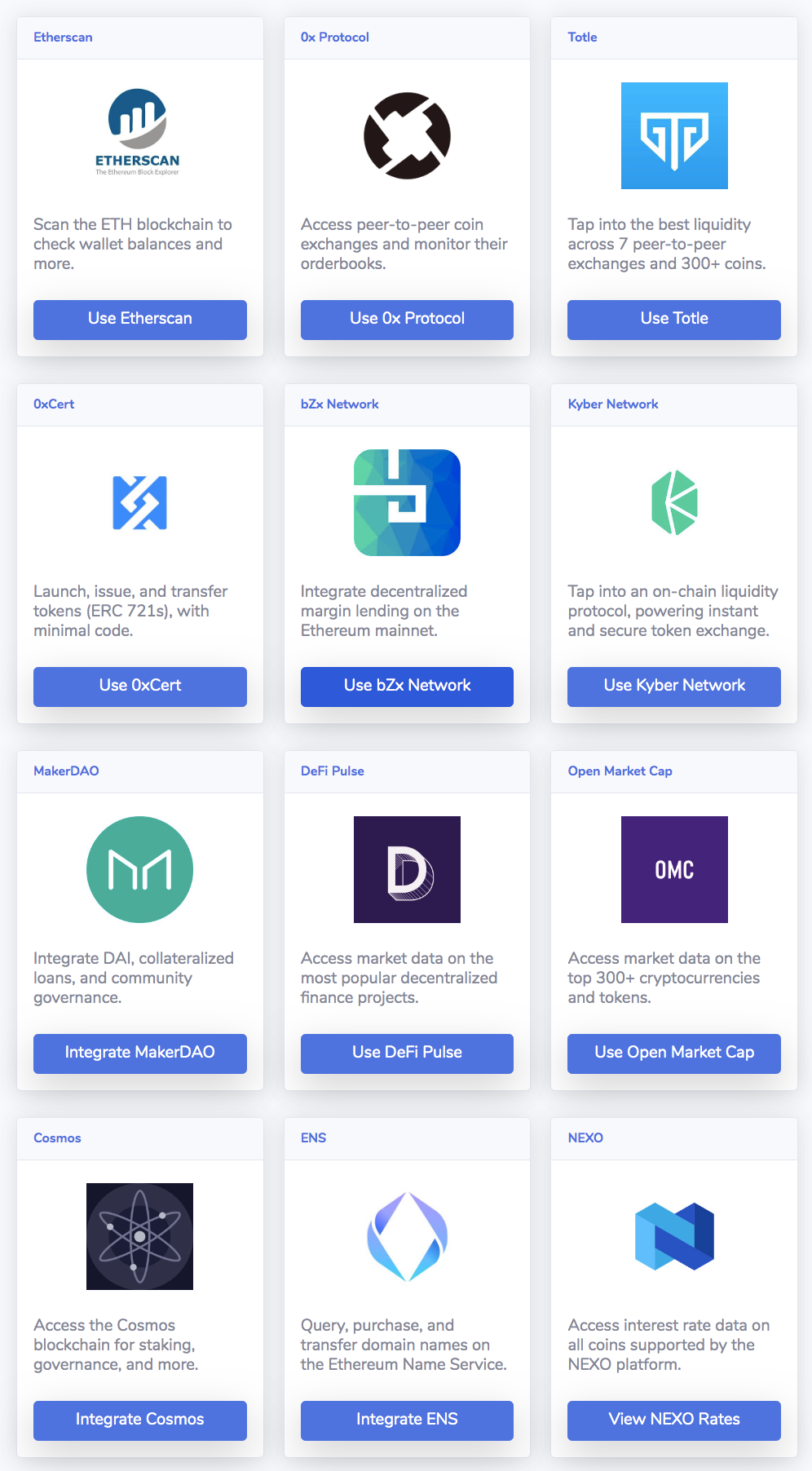 The service suite offers higher level Web 3.0 functionality for developers to perform specific actions. Currently, they offer the ability to launch, issue, and transfer non-fungible tokens, with less than 5 lines of code. The ability to spin up your own secondary marketplace or exchange, backed by the 0x Protocol, from a single API call will soon be available.
