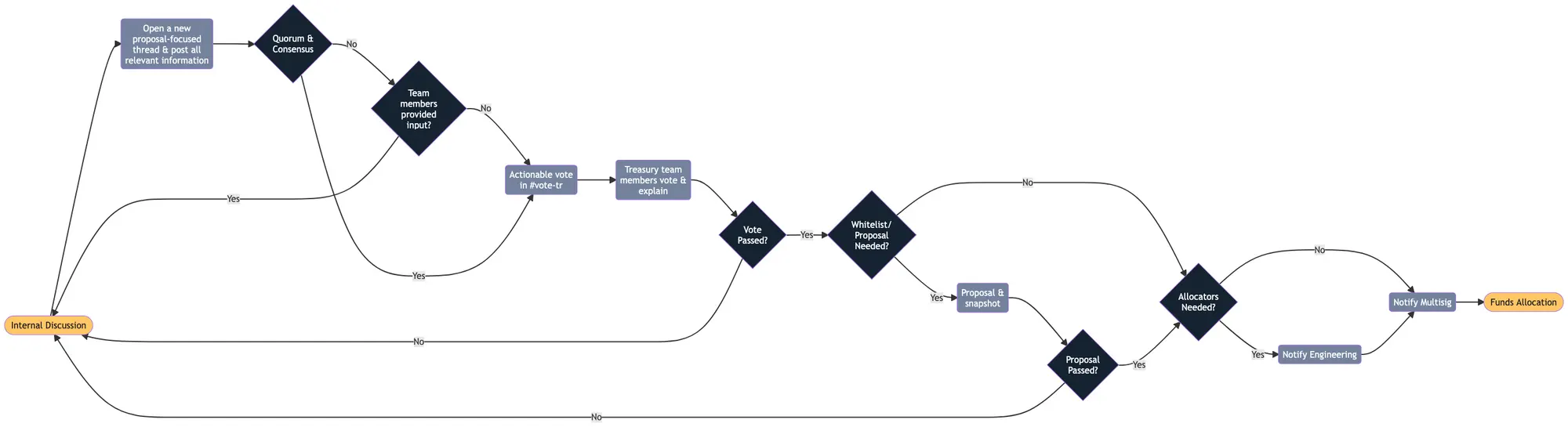 - The potential point of centralization happens when the idea passes initial voting in the thread. The Treasury team decides whether or not to move forward with the proposal. The Treasury team may also have the right to block a proposal before going public to the DAO.