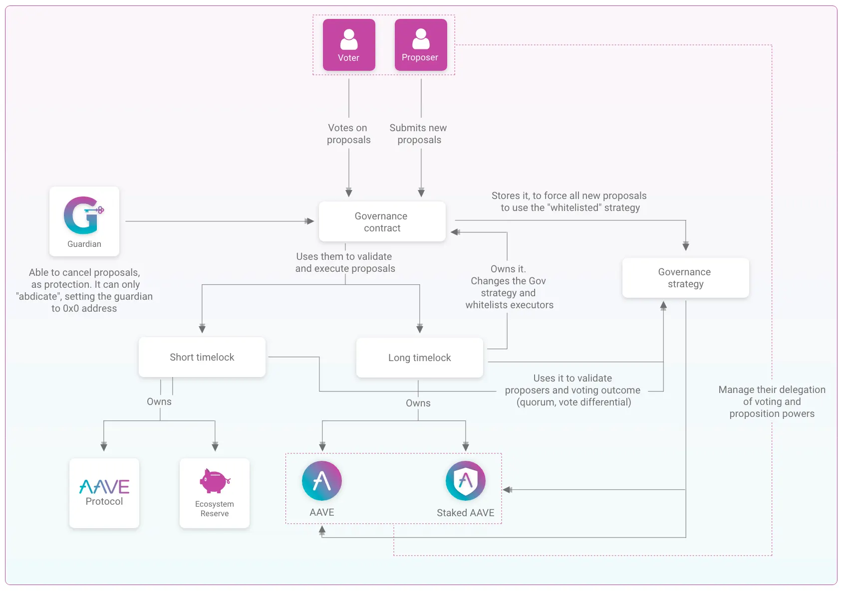- Snapshot voting - Off-chain voting that is used for community sentiment check. This is an optional step that helps to shape up the idea before on-chain voting. Every user with 50 AAVE can create a proposal.