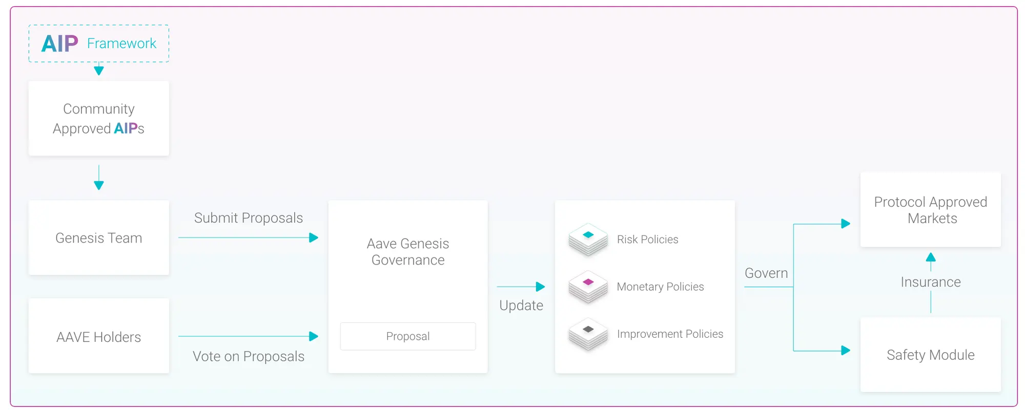 - In the case of on-chain voting, a proposal (AIP) can be initiated by any user with enough proposal power. The proposal is in the form of a Github pull request that should satisfy general criteria and pass the code checks. The Aave Genesis Team is responsible for request reviews. There is no open data on how the team makes their decisions, so there is a potential point of centralization.