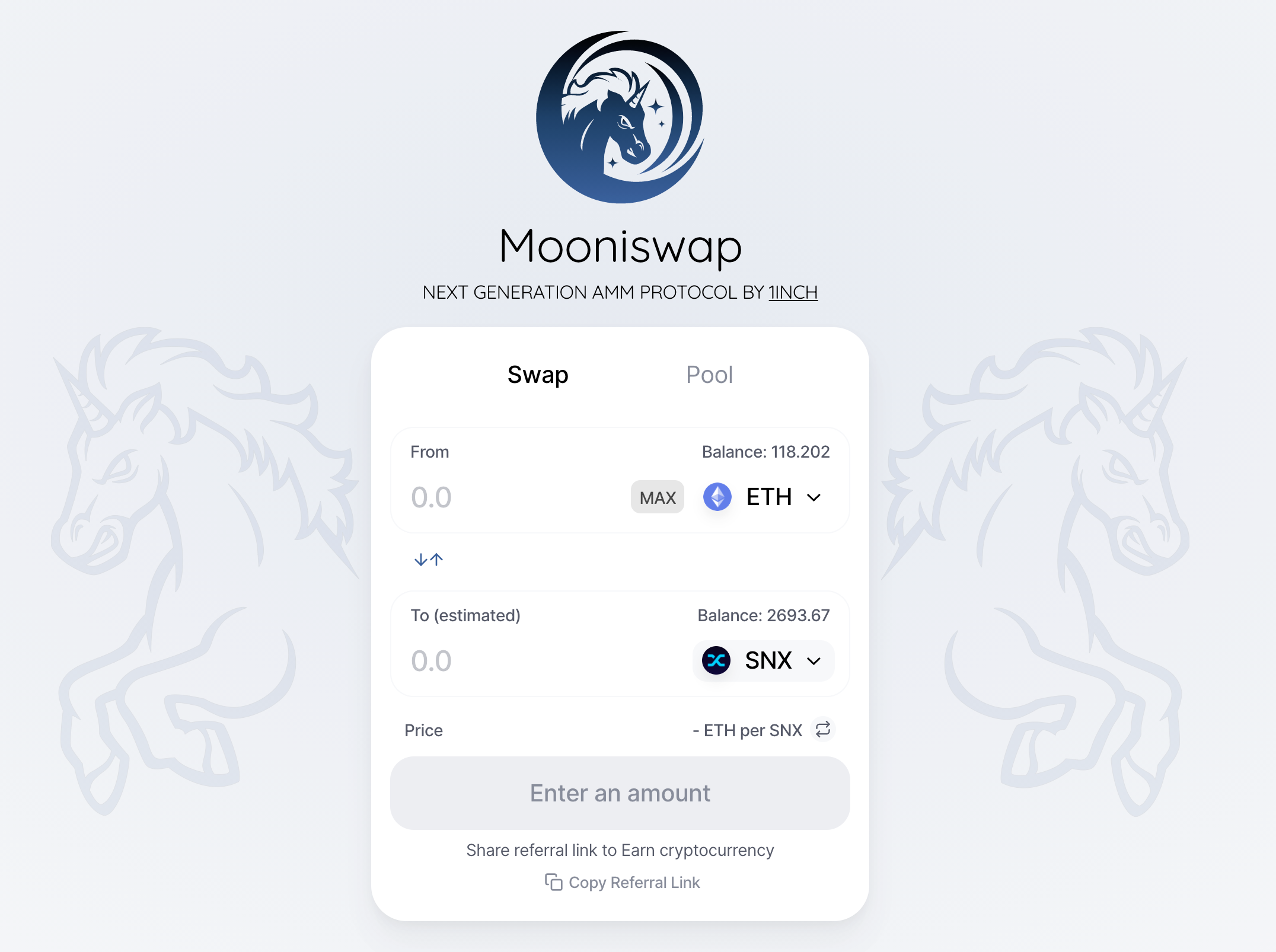 Mooniswap initially utilizes a 0.3% Swap Fee, which can be lowered all the way down to 0% in the future as a way to provide more competitive prices to the market. Moreover, Mooniswap introduces the Referral Fee to incentivise integrations with wallets and other services that increase trading volume and additional income for liquidity providers. The Referral Fee is only charged when the referral wallet is specified in transaction arguments.