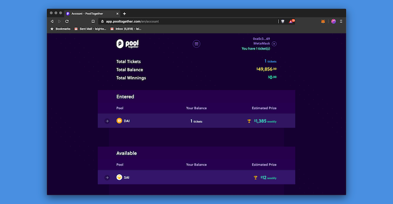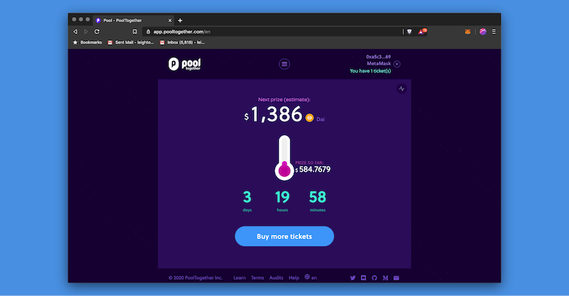 This is possible because the prize is funded by the interest that accrues on all of the money deposited. Your chance to win is directly proportional to the amount of money you deposit. So depositing 100 Dai will give you 100 tickets. If there is 500,000 Dai in the pool, then you’ll have a 1 in 50,000 chance of winning the prize each time. As long as your money stays in the pool, you are eligible to win prizes, and you can remove your money whenever you want it.