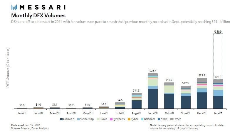 - Monthly DEX volume this Jan. 2021 is on pace to break the Sept. 2020 record of +$15B.