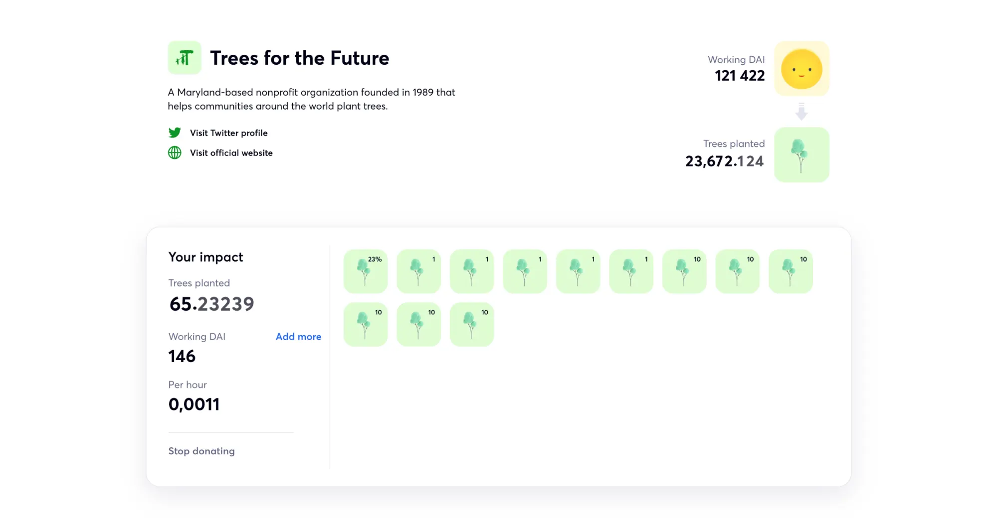 Spendless is an app to donate money without spending it. It works by depositing users’ DAI into Compound Finance to earn interest and then redirecting only the interest to a charitable campaign. Spendless shows users the continuously increasing impact that their funds are generating in the metric that matters most, like the number of trees planted or the number of megabytes archived from the user’s redirected interest.