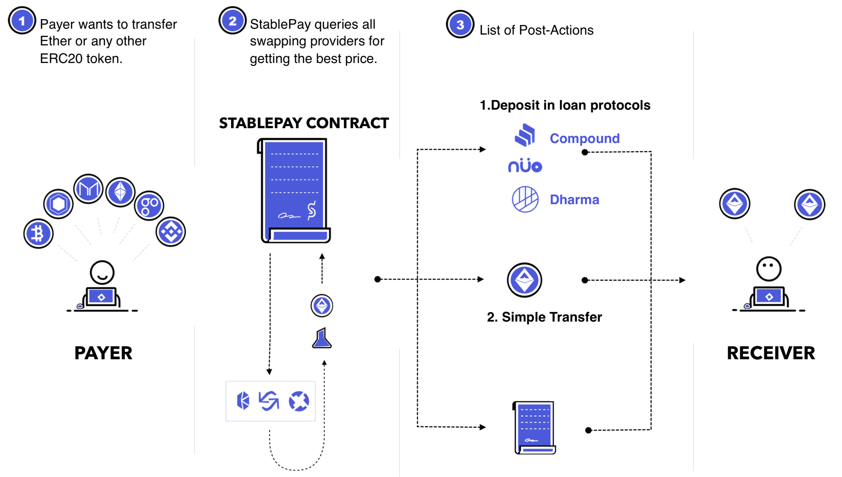 StablePay is a decentralized platform that enables users to receive DAI or cDAI (Compound DAI) regardless of the source token transferred. Basically, Alice sends ETH or XYZ ERC20 token, and Bob gets DAI, cDAI, or any other token that Bob prefers.