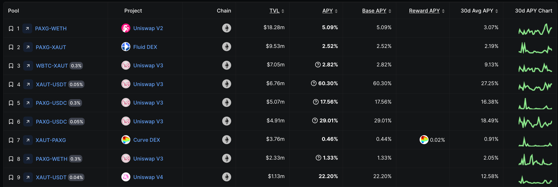 At the time of writing, the 30‑day average APY for the most actively traded tokenized gold pools on Uniswap ranged from 10% to 25%, reflecting strong trading activity and concentrated liquidity positions.