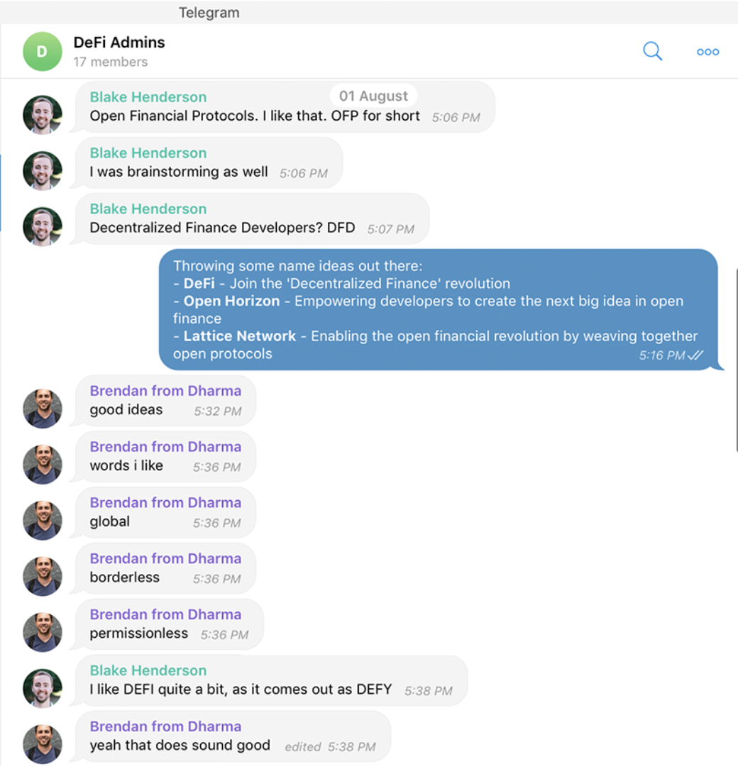 The first utterances of DeFi in a brainstorming session with the original DeFi creators.