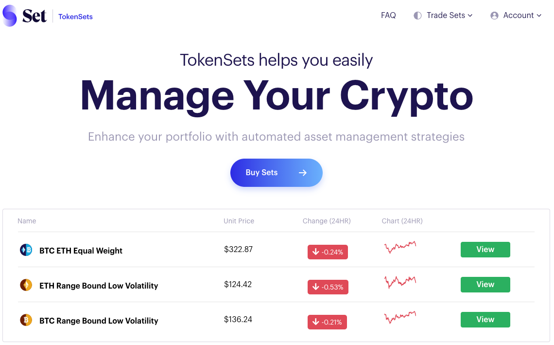 Today, I’m with my amazing team working on Set, with a mission to make wealth management accessible to the world. We’re the creators of TokenSets, a platform that allows you to easily manage your crypto and the protocol itself that powers the whole thing. We felt the pain of riding crypto down turns and not buying in early enough, and wanted a system that can help you manage your crypto to avoid those pains. Eventually we created the Set protocol and TokenSets with the goal of helping people carry out asset management strategies using smart structured products.